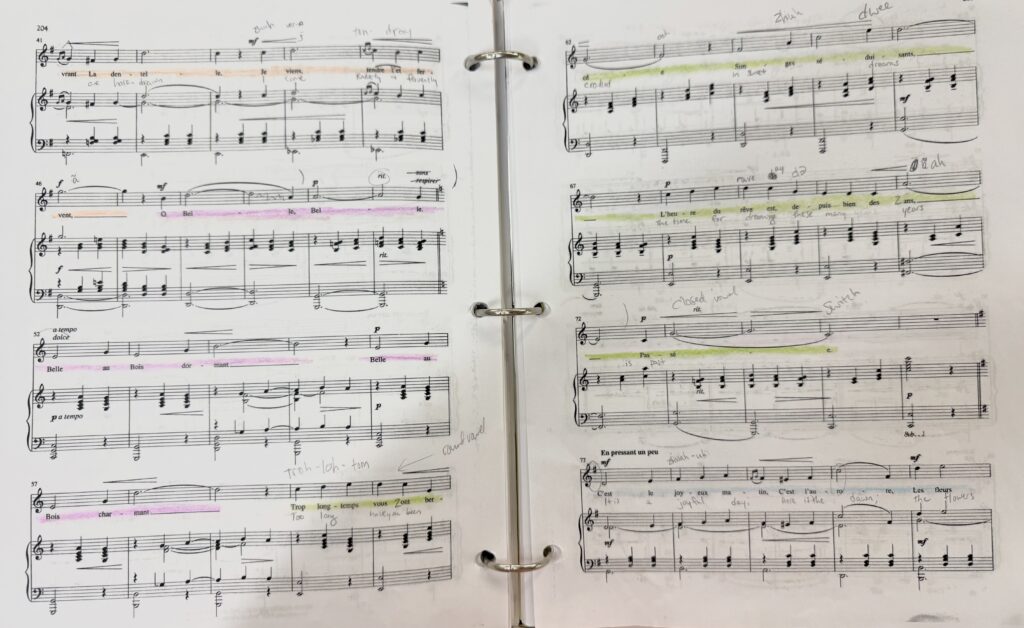 Color coding is my favorite method for learning the overall flow of a song. Here’s my process: Depending on the song, I will use different colors for each verse or section. Any repetitions (e.g. a chorus) get the same color, and if the lyrics are repeated but the vocal line changes, then I show that with a combination of highlighting and underlining. Rainbow order is helpful sometimes; other times I choose colors that just feel right for the passage (e.g., blue for a sad bridge or yellow for a verse about sunshine). During a performance, visualizing the colors keeps me on track.