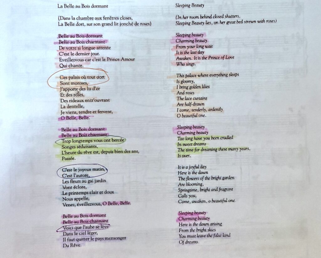 When learning a song in a foreign language, it’s critical to copy out a translation (like step 2, but in English). Better yet, copy out two translations: one poetic and one in literal, plain language. Writing your own plain language translation can also help you connect to the text of an English song.